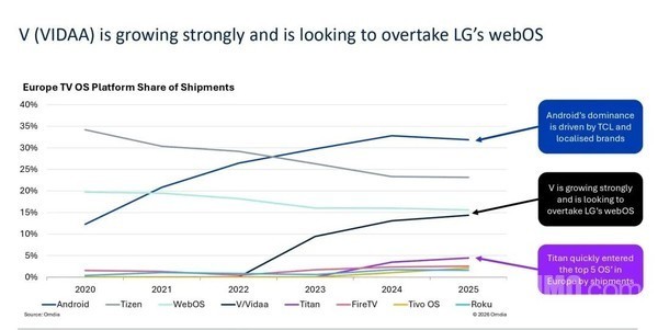 【CNMO科技消息】4月17日,Omdia预测,由海信开发的智能电视操作系统V(前身为VIDAA)将于2025年在欧洲出货量上超越LG的webOS,标志着智能电视市场竞争格局出现重大转变。